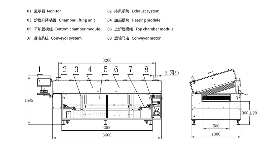 | 1.可選:機頭機尾可凸出,凸出上爐膛外側(cè)面尺寸300mm(整機尺寸會加長600mm)。 2.注明:根據(jù)產(chǎn)能要求,推薦溫區(qū)數(shù)量優(yōu)先選擇:4溫區(qū)、5溫區(qū)、 8溫區(qū)、9溫區(qū)、10溫區(qū)、12溫區(qū),可定制。 | |||